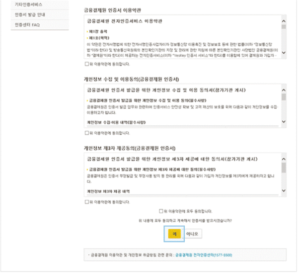 3. 발급하고자 하는 인증서의 내용을 확인하여 종류를 선택한 후 약관에 동의합니다.