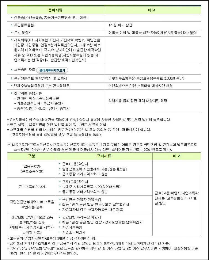 ※ 기본적인 자격조건만 충족한다면 저소득 저신용자분들도 승인이 잘 되는 편입니다. 그러므로, 대출 가능 여부를 미리 걱정하지 마시고 신청자격에 해당이 된다면 일단 신청부터 해보시기 바랍니다.