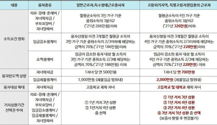 근로자 생활안정자금은 용도별 대출한도 및 대출조건에 약간 차이가 있는데요. 이를 정리하면 다음과 같습니다.