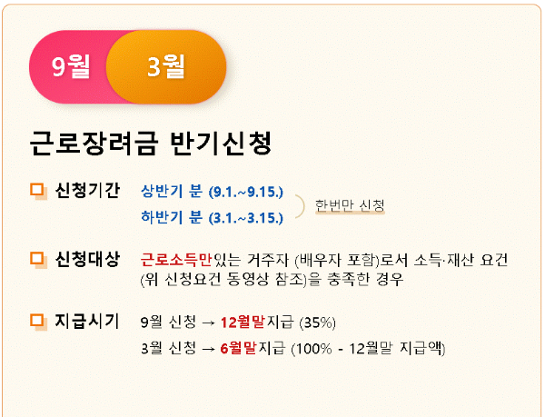 ※ 반기 근로장려금 기준은 2022년도 하반기에 근로소득만 발생했고 아래 소득/재산요건을 충족할경우에 지급됩니다.