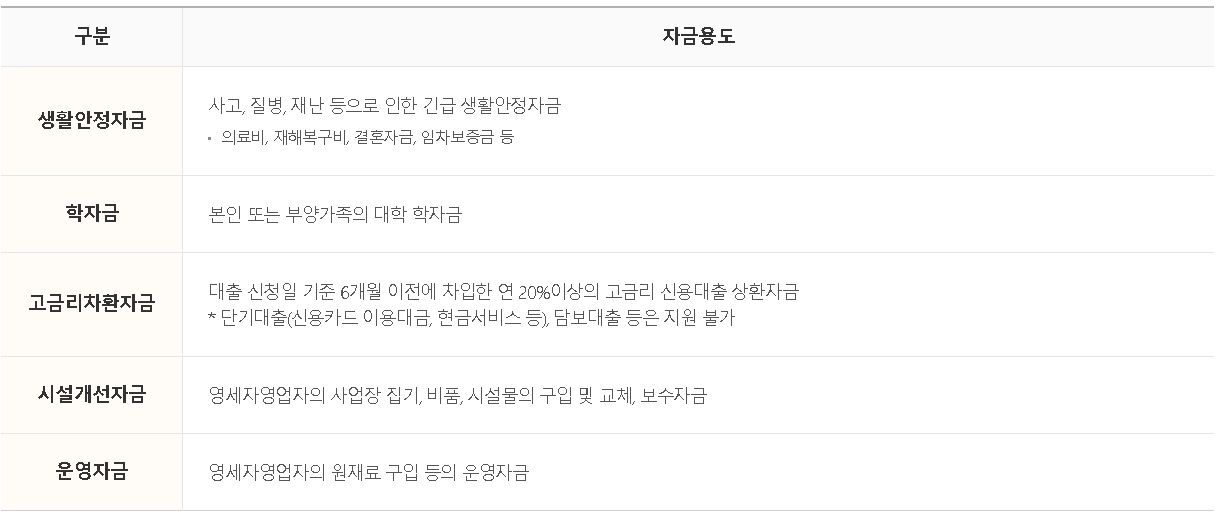 - 성실상환자 대출은 아래의 대출용도(지원용도)로 신청이 가능한데요. 가장 많이 취급되고 있는 생활안정자금의 경우 통상적으로 1회에 300만원정도 실행이 되고 있습니다.