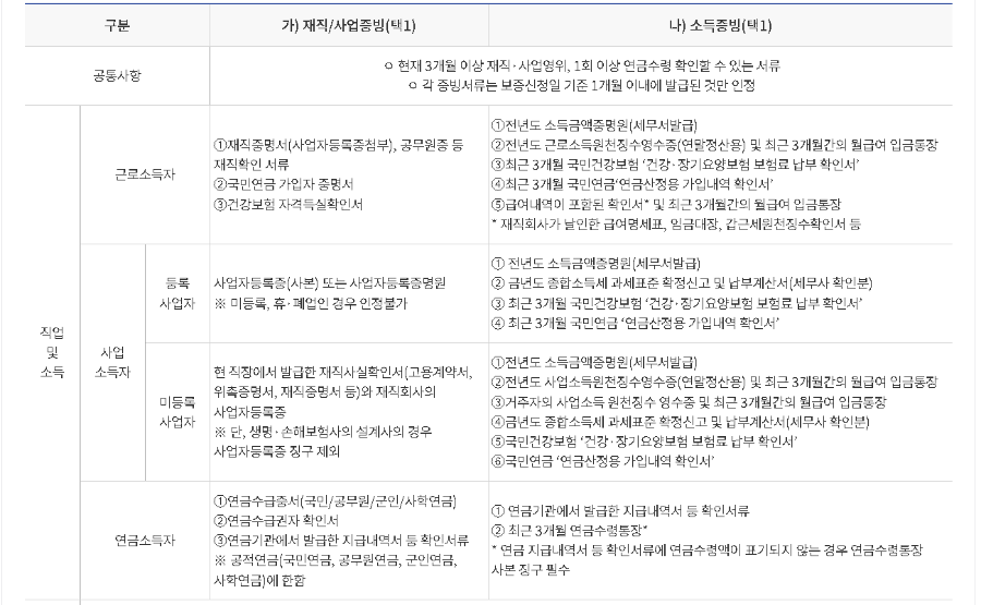 현재 3개월 이상 재직 사업영위(또는 1회 이상 연금수령) 확인을 위해 재직, 사업 증빙 및 소득증빙 서류 제출이 필요하며, 주민등록증 등 실명확인증표는 공통적으로 필요합니다.
